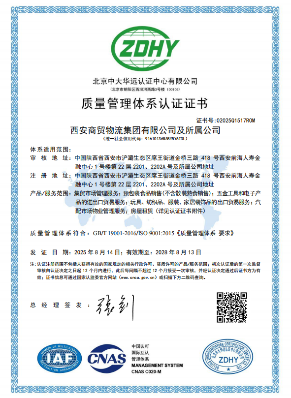 近日,西安商貿(mào)物流集團(tuán)及所屬公司獲得ISO9001質(zhì)量管理體系認(rèn)證證書。這是集團(tuán)組建成立后在推進(jìn)戰(zhàn)略規(guī)劃、塑造品牌形象、提升國(guó)內(nèi)外綜合實(shí)力進(jìn)程中的又一重要成果,標(biāo)志著集團(tuán)在國(guó)際化、制度化、規(guī)范化管理方面邁上新臺(tái)階。