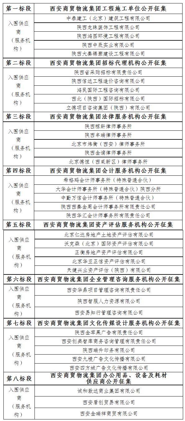 請(qǐng)各入圍供應(yīng)商(服務(wù)機(jī)構(gòu))于2022年11月15日至2022年11月17日持單位介紹信或法人授權(quán)委托書(shū)(授權(quán)代表)到西安商貿(mào)物流集團(tuán)企劃發(fā)展部(前海金融人壽中心1號(hào)樓2201室)領(lǐng)取入圍通知書(shū)。